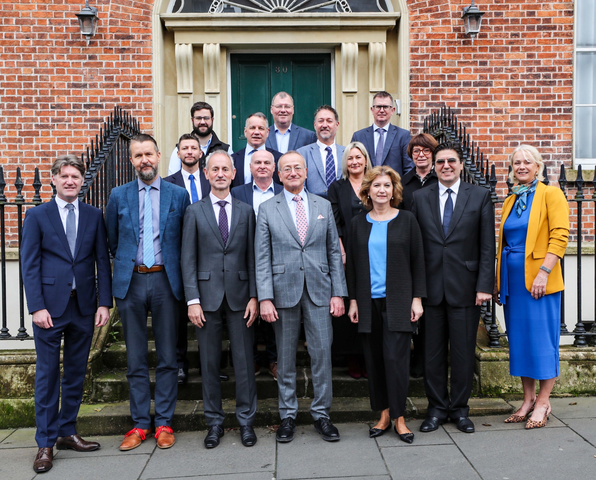 Mr Pedro Serrano, European Union Ambassador to the United Kingdom, centre, and fellow European Ambassadors and Chamber of Commerce members at a reception hosted by the chamber in the Bishop’s Gate Hotel. Included at front, are Andrew Fleming, chamber president, Ambassador Sven Sakkov, (Estonia), Ambassador Jeroen Cooreman, (Belgium), Ambassador Laura Popescu, (Romania), Ambassador Tihomir Stoytchev, (Bulgaria) and Anna Doherty, Chamber CEO.