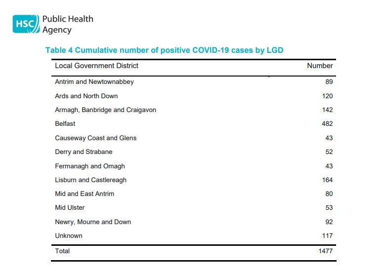 As of, 9 April at 11:15am testing has resulted in 138 new positive cases, bringing the total number of confirmed cases in Northern Ireland to 1477.