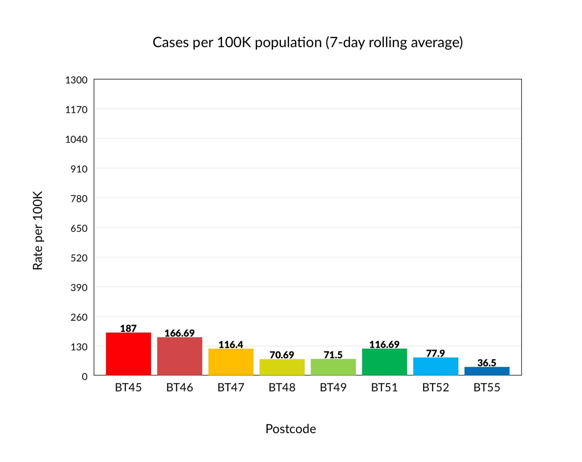 Just two postal areas, BT55 and BT47 saw an increase in cases over the last week, with the Dungiven/Waterside area seeing a 6.7% rise.