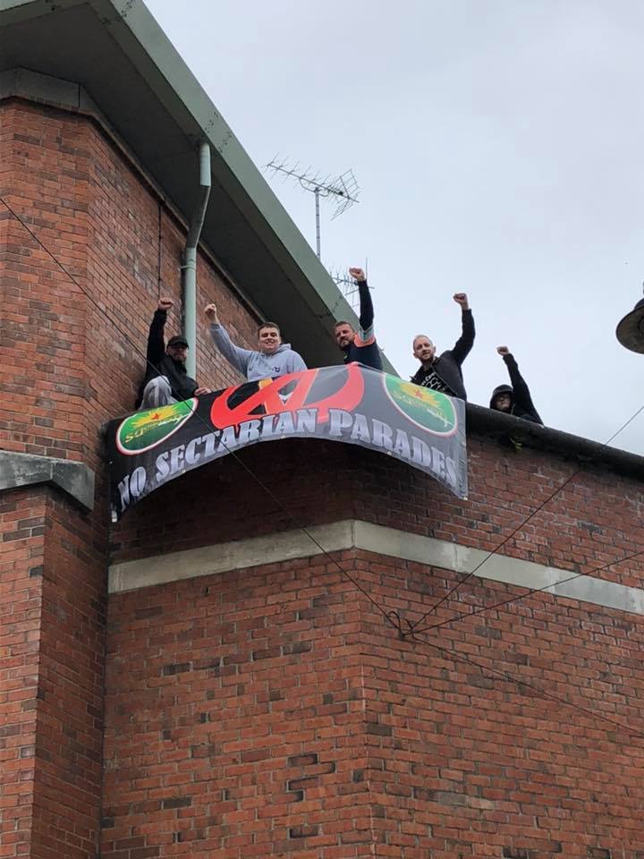 Members of the Clydvalley Flute Band, from Larne, wore a Parachute Regiment symbol with the letter “F” on their shirts during the annuall Apprentice Boys parade in the city.