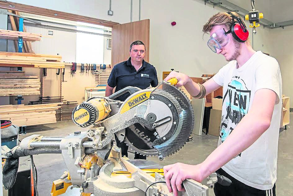 Ruairi Gallagher practices with the chop saw while being supervised by lecturer Gavin Campbell.
