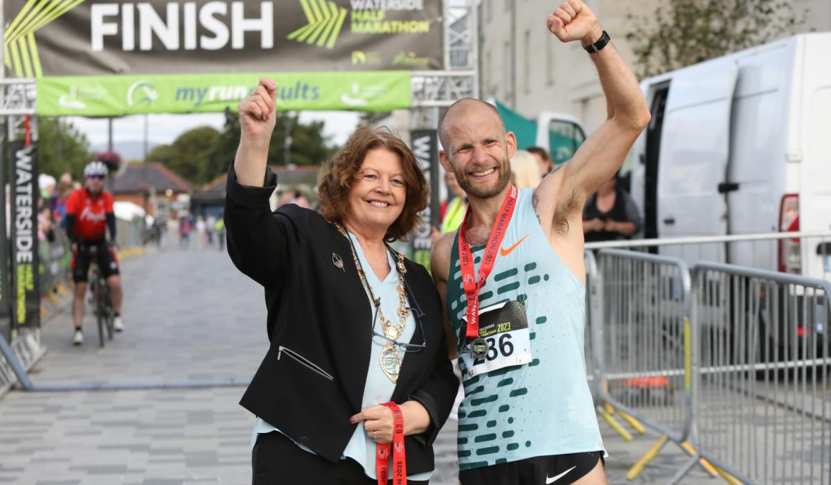 Mayor Patricia Logue with Waterside Half Marathon winner Kyle Doherty. Pic by Tom Heaney, nwpresspics