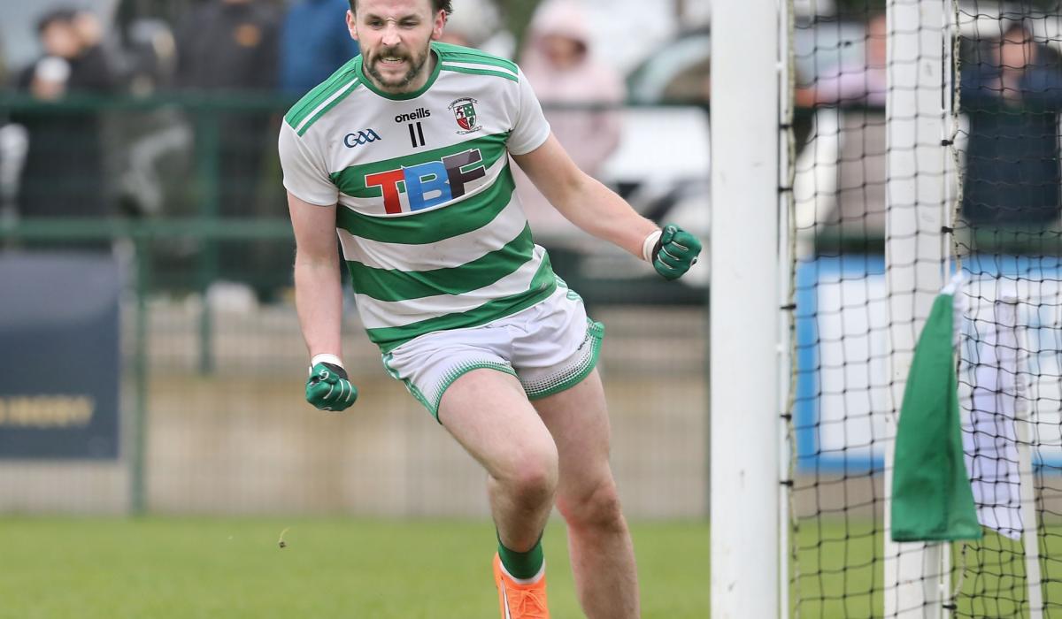 Swatragh Patrick Kearney celebrates his goal against Bellaghy during the Derry Senior Football Championship match on Saturday. Picture Margaret McLaughlin 23-9-2023