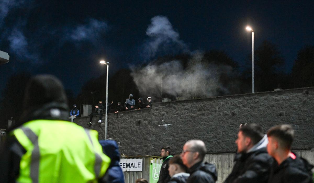 The flare ended up on the pitch, where an unidentified youth picked it up and ran the length of the field, disrupting the game even further. The trouble continued after the final whistle and Shamrock Rovers fans had to be moved onto the centre of the pitch for their own safety. As this was happening, masked youths broke into the ground from the Lone Moor Road, before quickly dispersing, with the PSNI arriving.