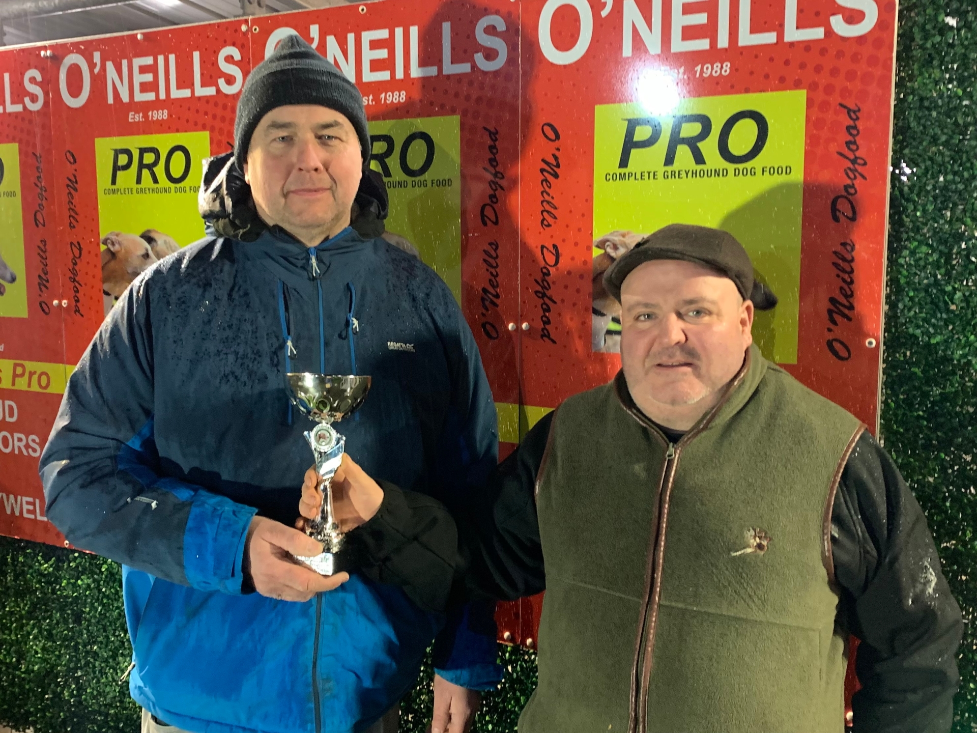 Johnny Scott (left) was presented with a trophy by Barry Holland after Ferndale Power was voted our favourite performer at a recent race meeting. Trophy sponsored by Michael Taggart.