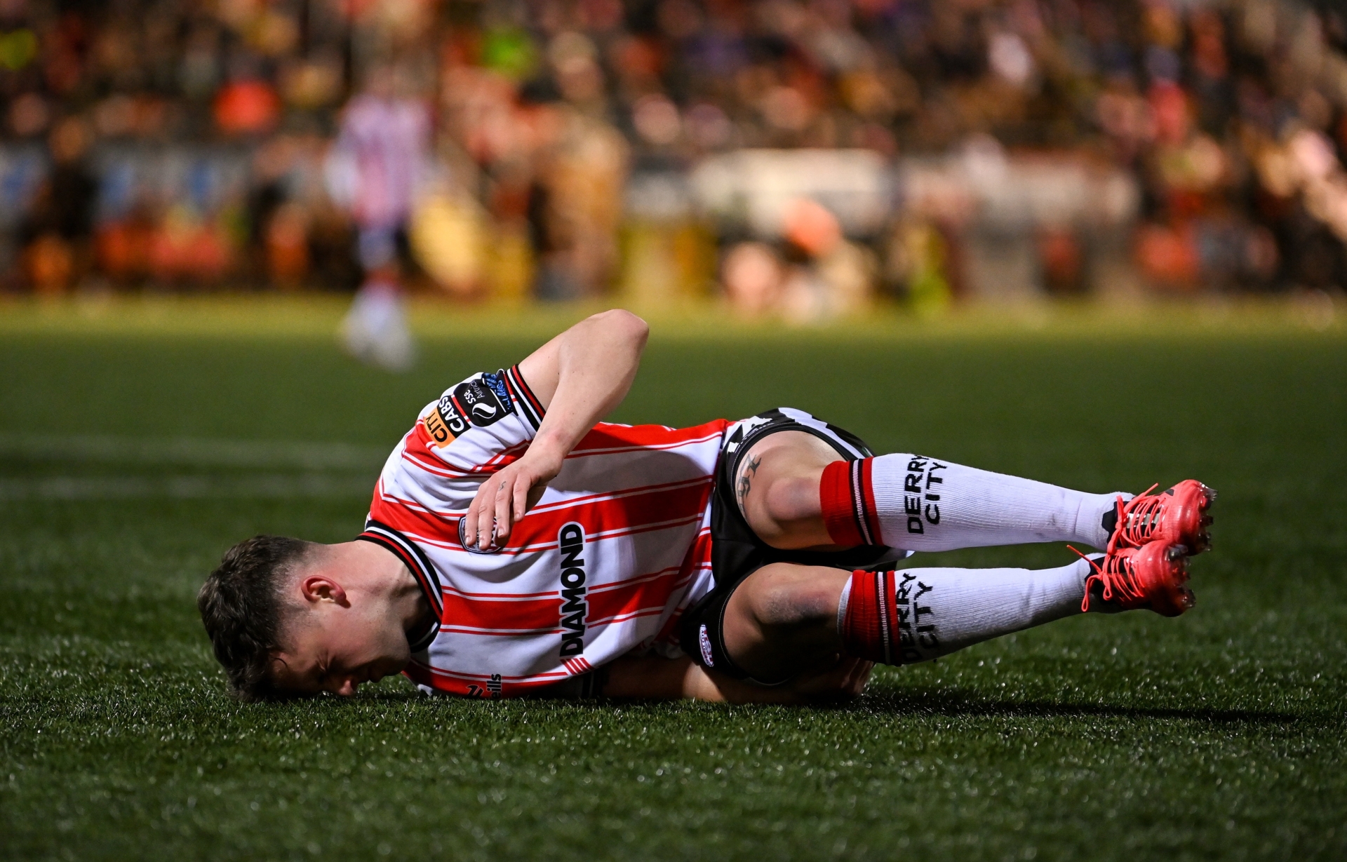 Ben Doherty of Derry City after picking up an injury during the SSE Airtricity Men's Premier Division match between Derry City and Bohemians. (Photo: Ramsey Cardy/Sportsfile)