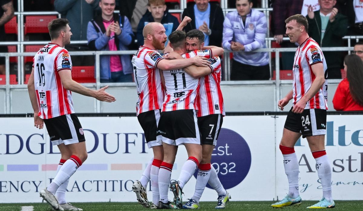 Derry City players celebrate their second goal in three minutes. Pic by Shauna Clinton/ Sportsfile