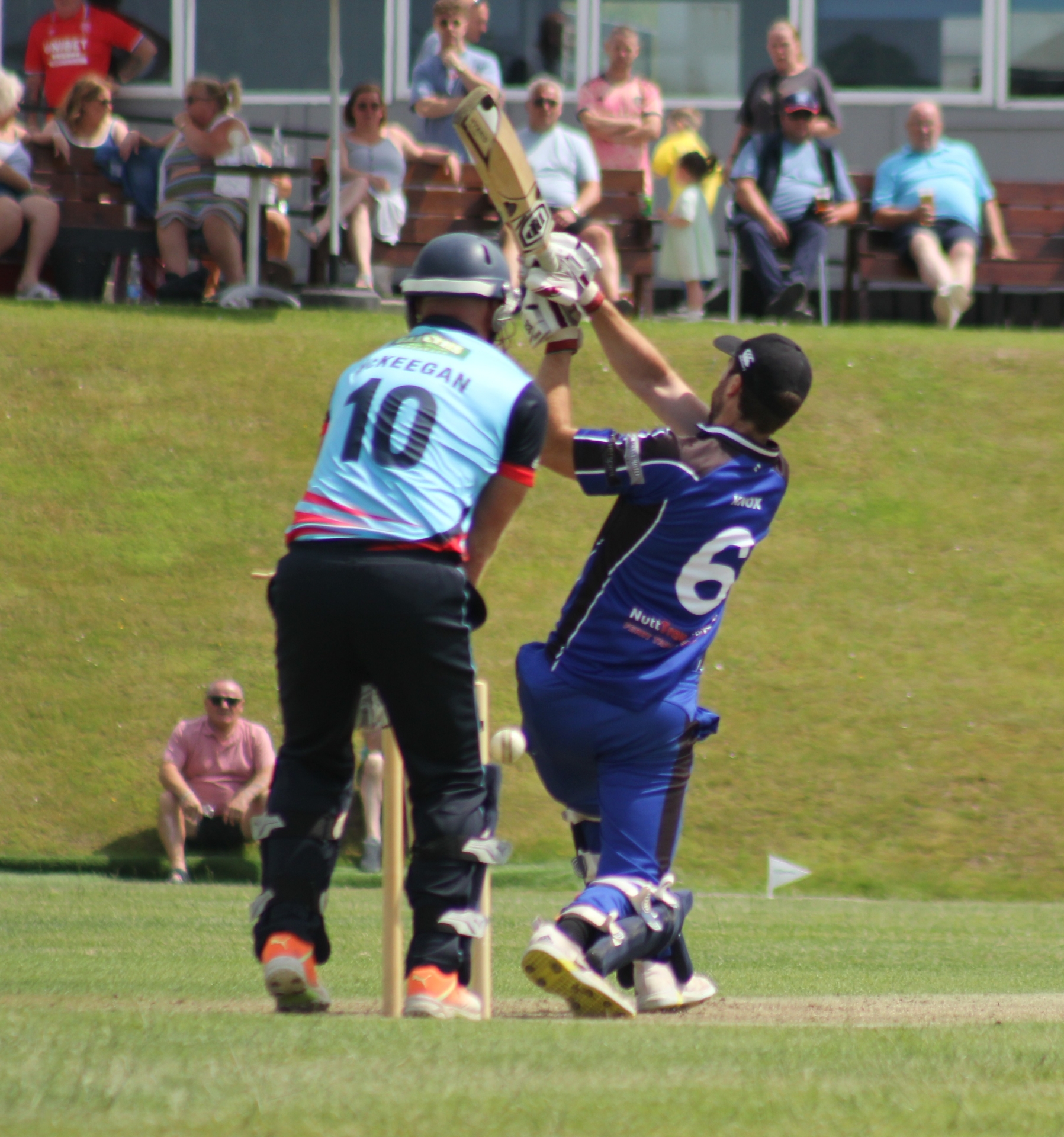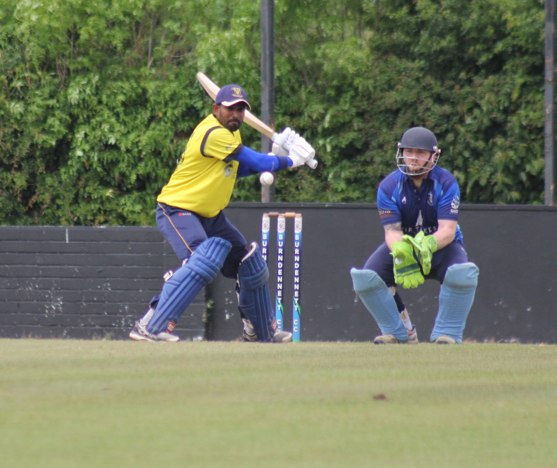Fox Lodge professional Gayan Maneeshan on his way to a century at Burndennett on Saturday.