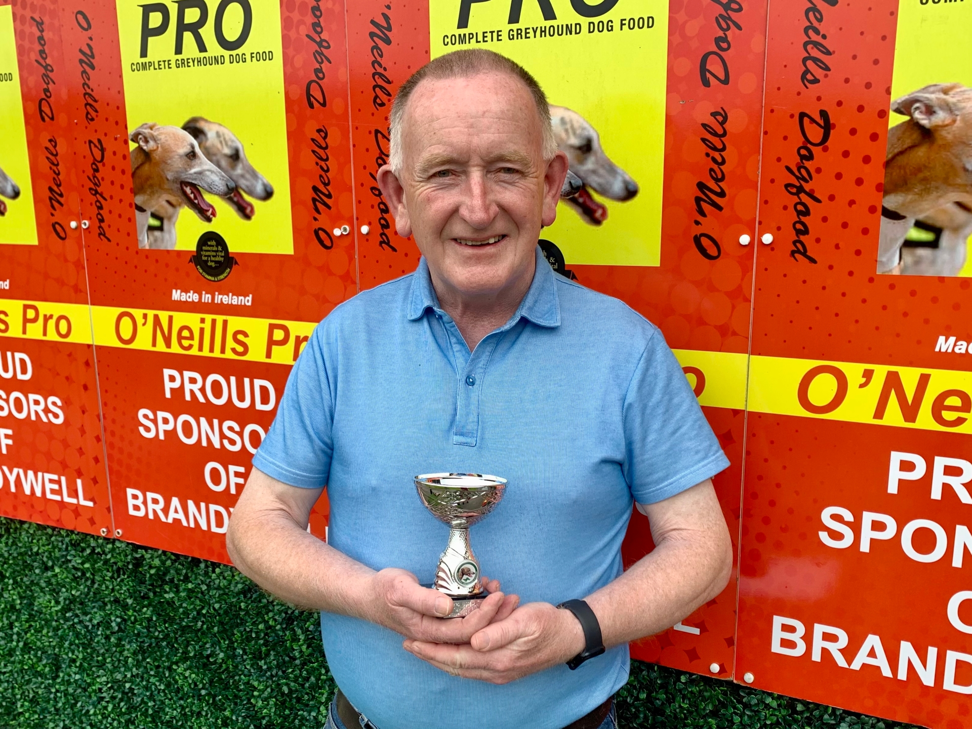 Brandywell; Paul Hughes with the veteran winners trophy that ONTIMEFORTHREE won at our last race meeting on 14/7/25. Sponsored by Danny McGilloway.