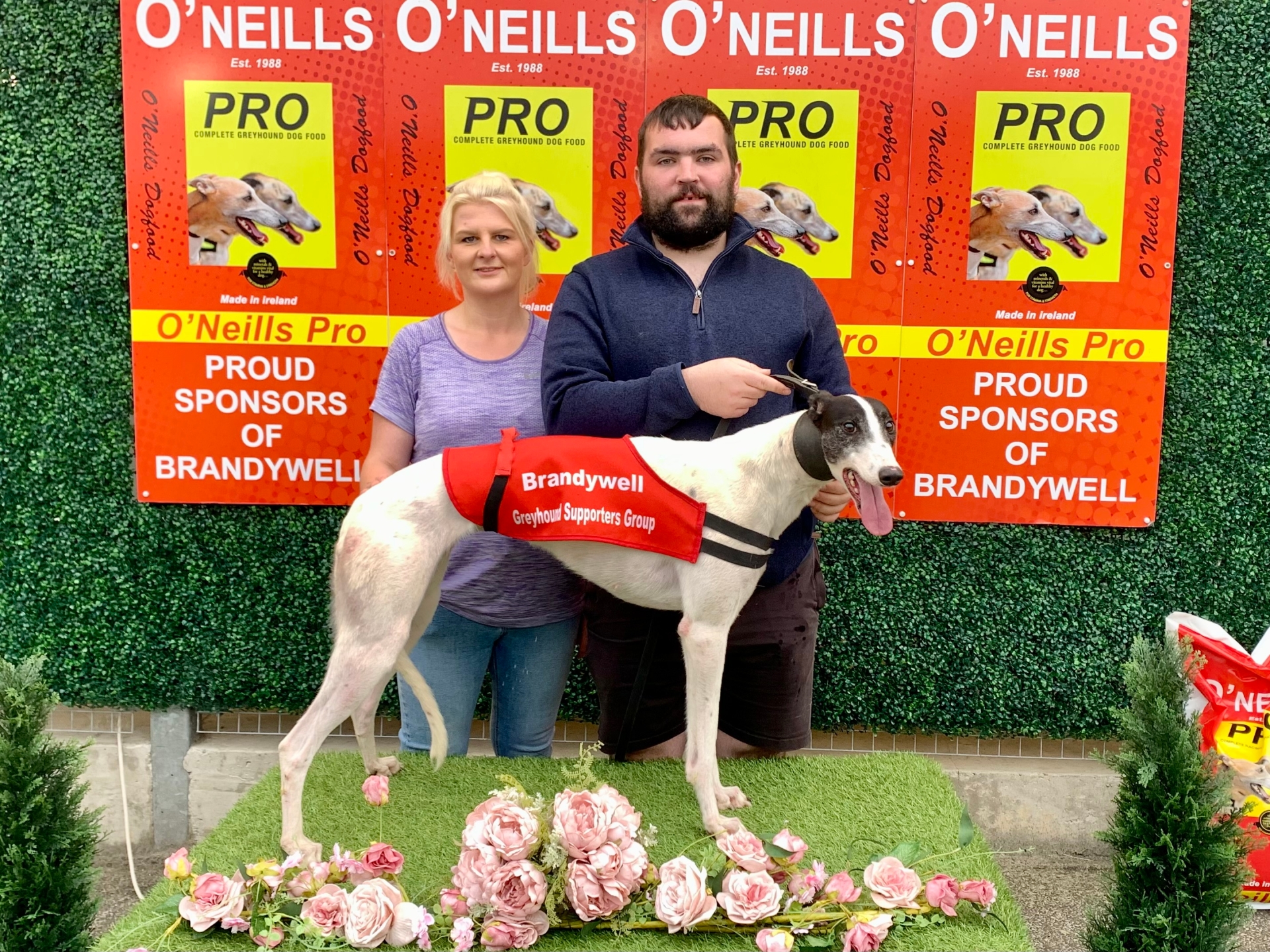 Fast away from trap 4, Nelly was joined by Skywalker Tina on her inside at the first turn but Nelly ran a terrific first bend to regain the advantage which she held to the line to win by 1 length in 17.01. She has had a terrific start to her career, winning all three of her races. Nelly also won the £50 Brandywell Greyhound Supporters Group Bonus in this race.