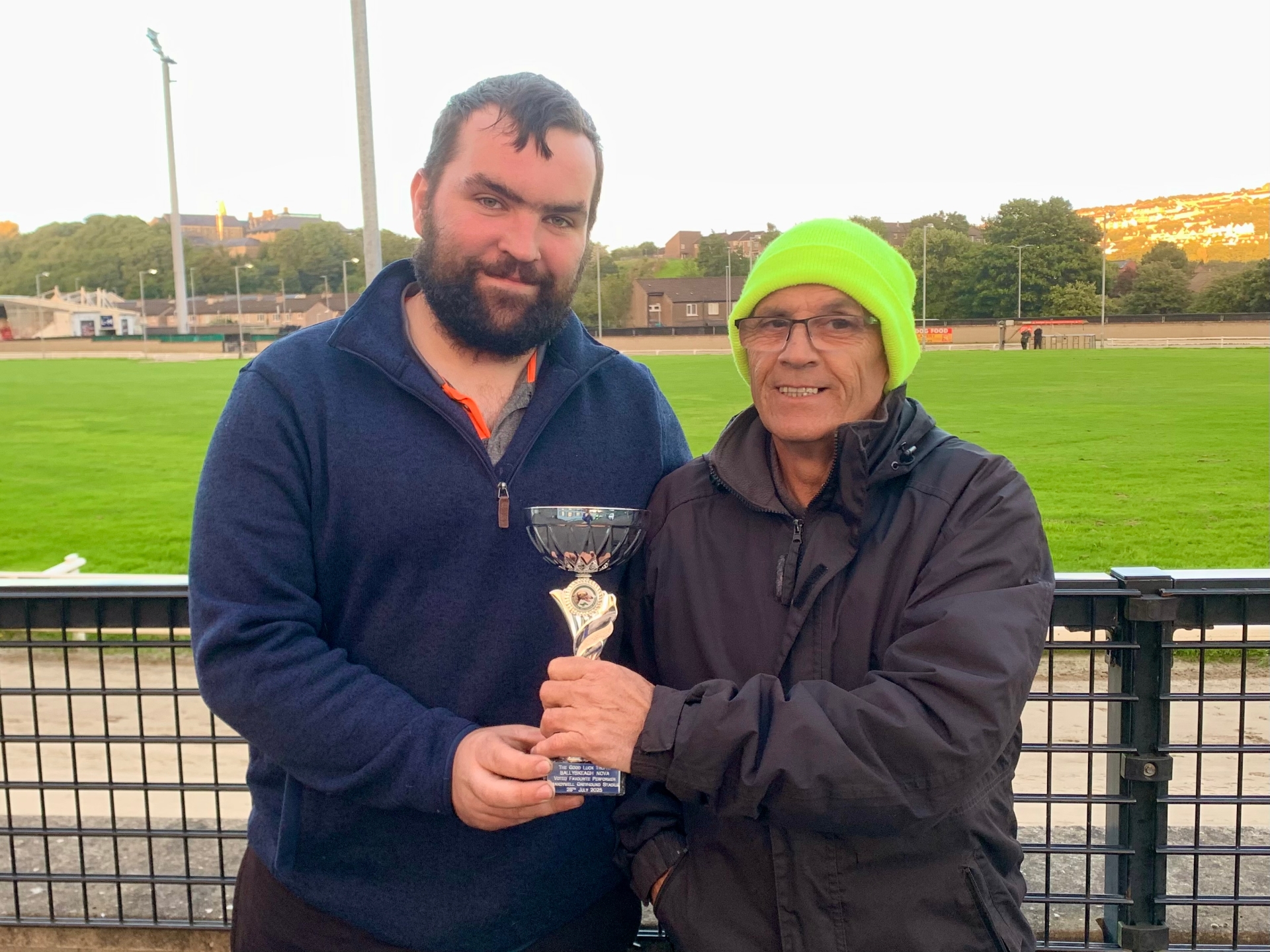 Patrick Gibson (left) was presented with the Good Luck Trophy sponsored by Damien Cullen after Ballyskeagh Nova was voted our favourite performer at last week’s meeting. Trophy presented by Patsy Doyle from the Brandywell Greyhound Supporters Group.