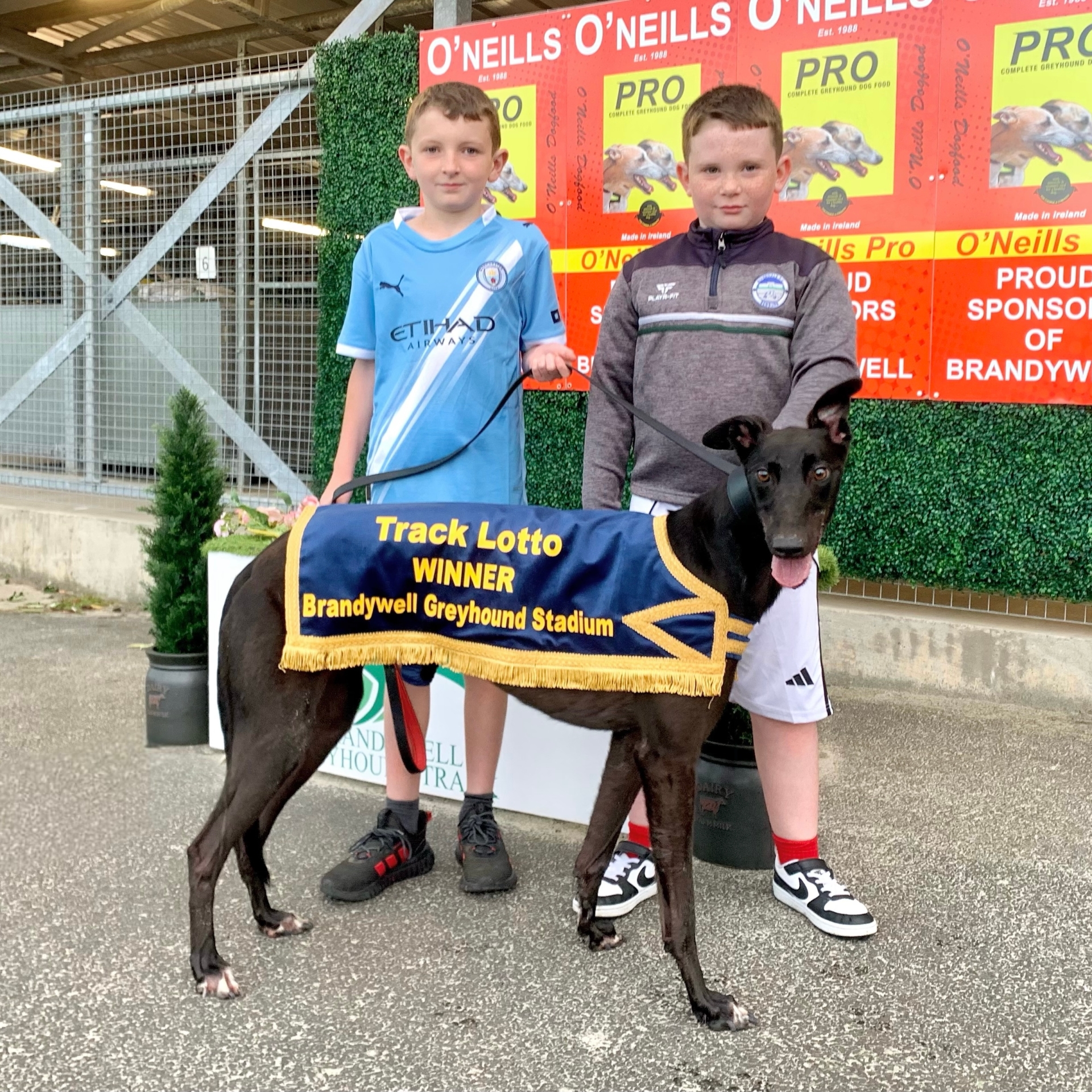 Brandywell Race 3, The Johnny Mc Laughlin Memorial Sprint 300 Yds. 2nd Semi-Final was won by CEE OR SEVEN in 17.16. Pictured with Danny McCormack & Riley McCormack.