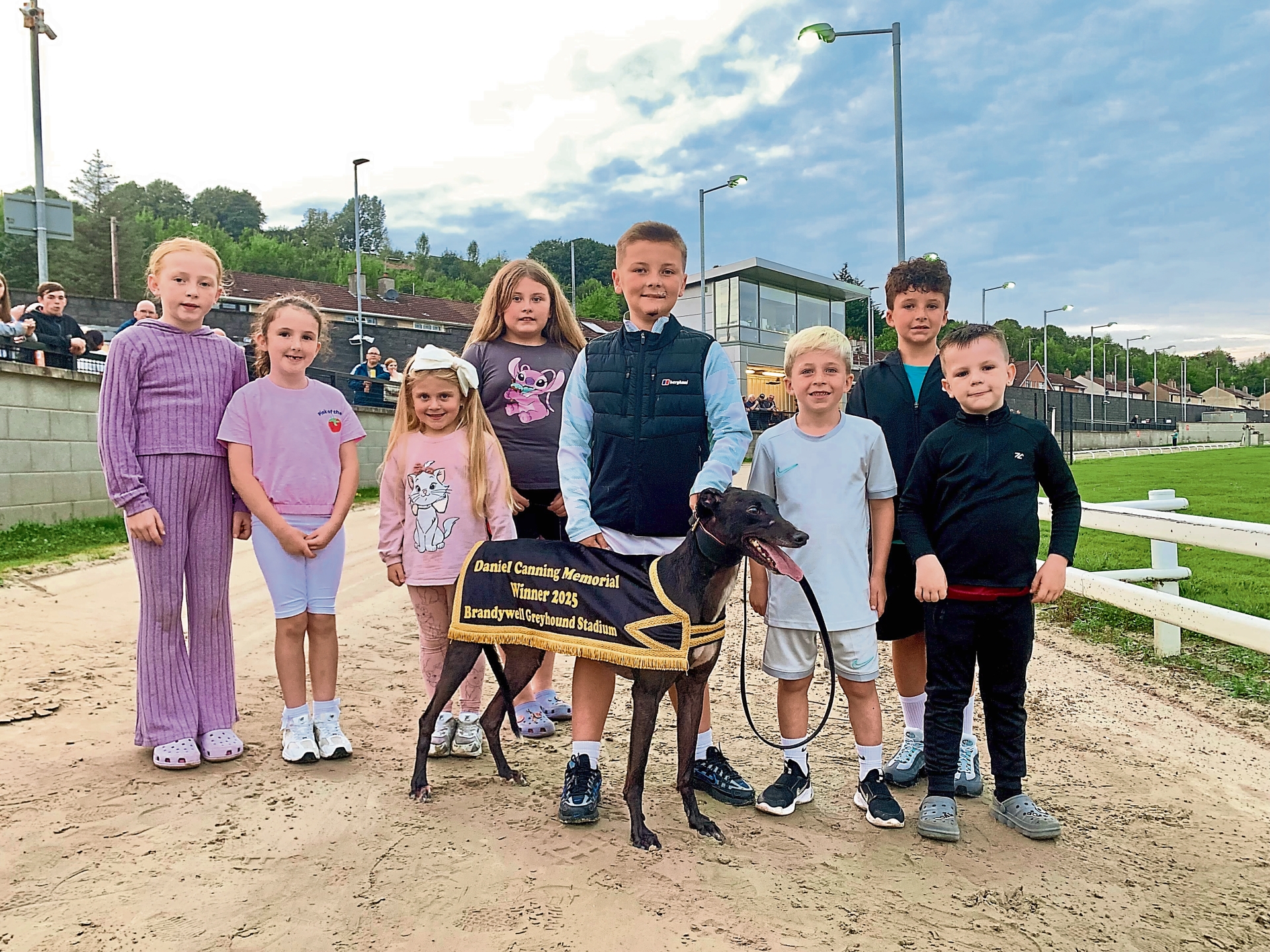 Brandywell; RACE 4, THE DANIEL CANNING MEMORIAL 500 FINAL was won by CATUNDA QUINN in 28.41. Shane McColgan is holding the winner & is surrounded by many of the Canning children.