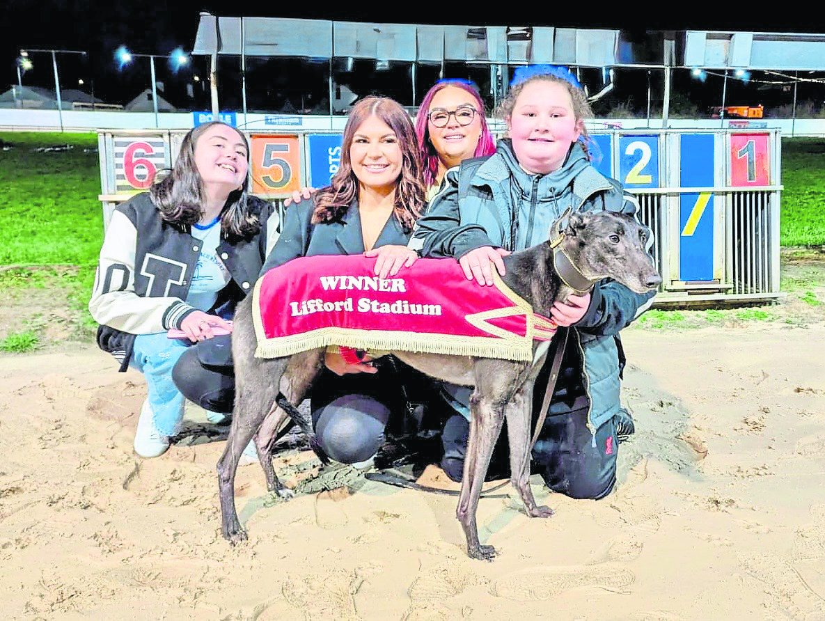Lifford Race 11 - A7 525 was won by SHES A SHOWGIRL in 30.59. Pictured with (from left). Rhylie Mc Bride, Nicole Stewart, Rhianna Mc Bride & Caeleen Anderson.