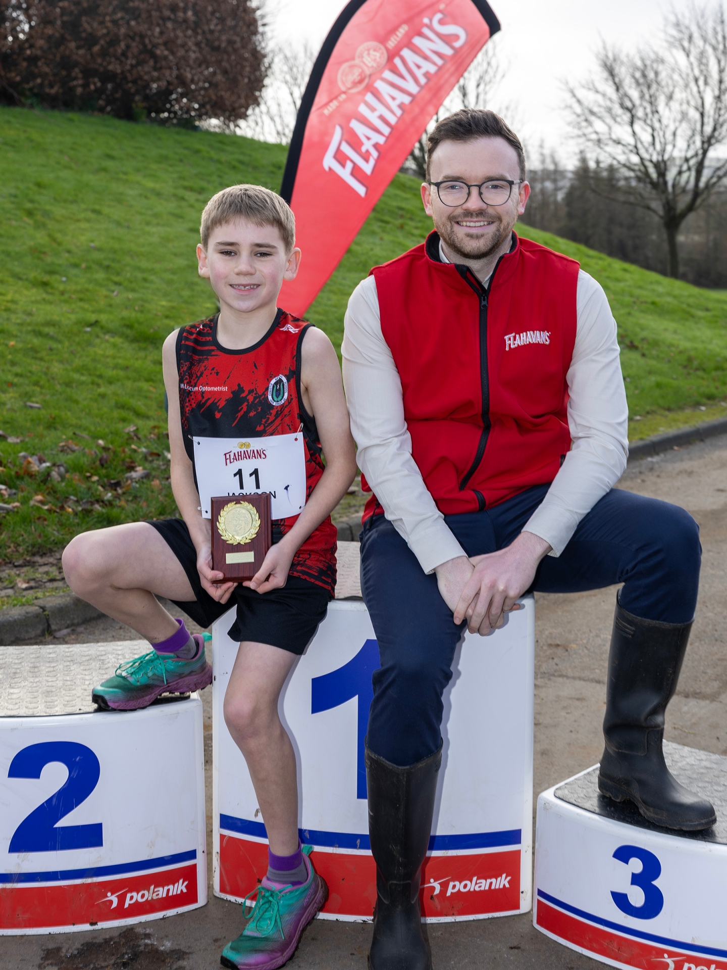 Pictured is Boy’s Race winner Jackson Nellins (R) from DH Christie Memorial Primary School, Coleraine alongside Flahavan’s representative James Whelan at the final of the Flahavan’s Primary School Cross Country League.
