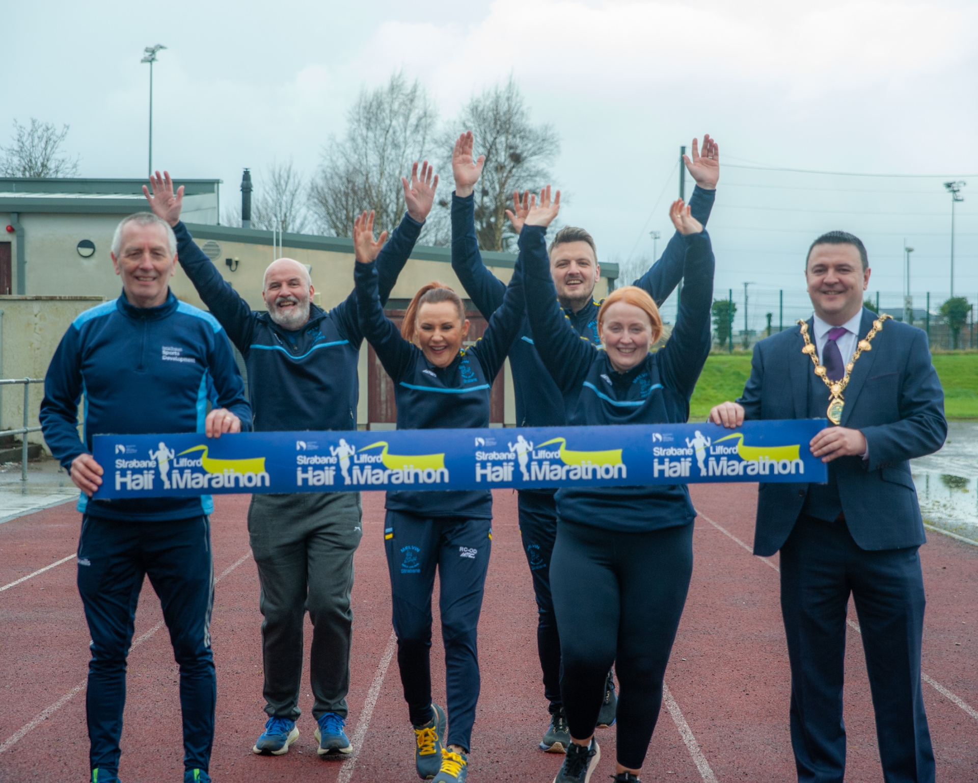 Mayor of Derry City and Strabane District Council, Councillor Ruairí McHugh, launching the 2026 Strabane Lifford Half Marathon with Council’s Sports Development Officer Mark Connolly and members of Melvin Runners.