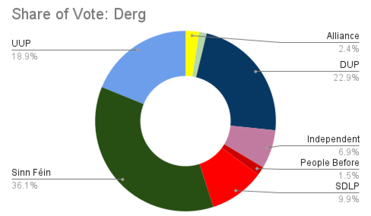 The seat breakdown in Derg in 2023 replicated the 2014 results, the ward returned 3 Sinn Féin, 1 DUP and 1 UUP candidate. In 2019, Derg returned 2 Sinn Féin, 1 DUP, 1 UUP and 1 SDLP candidate. The SDLP gained a seat from Sinn Féin.