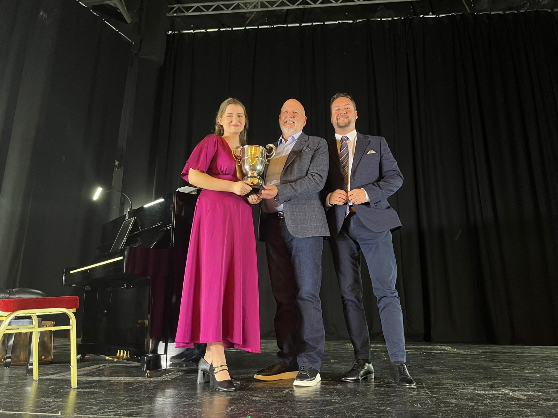 On the left is Cliodhan Regan pictured receiving her winner’s cup on the stage of St Columb’s Hall at last year’s Derry Feis. Pictured far right is Darren Hargan who adjudicated at the feis in 2025.