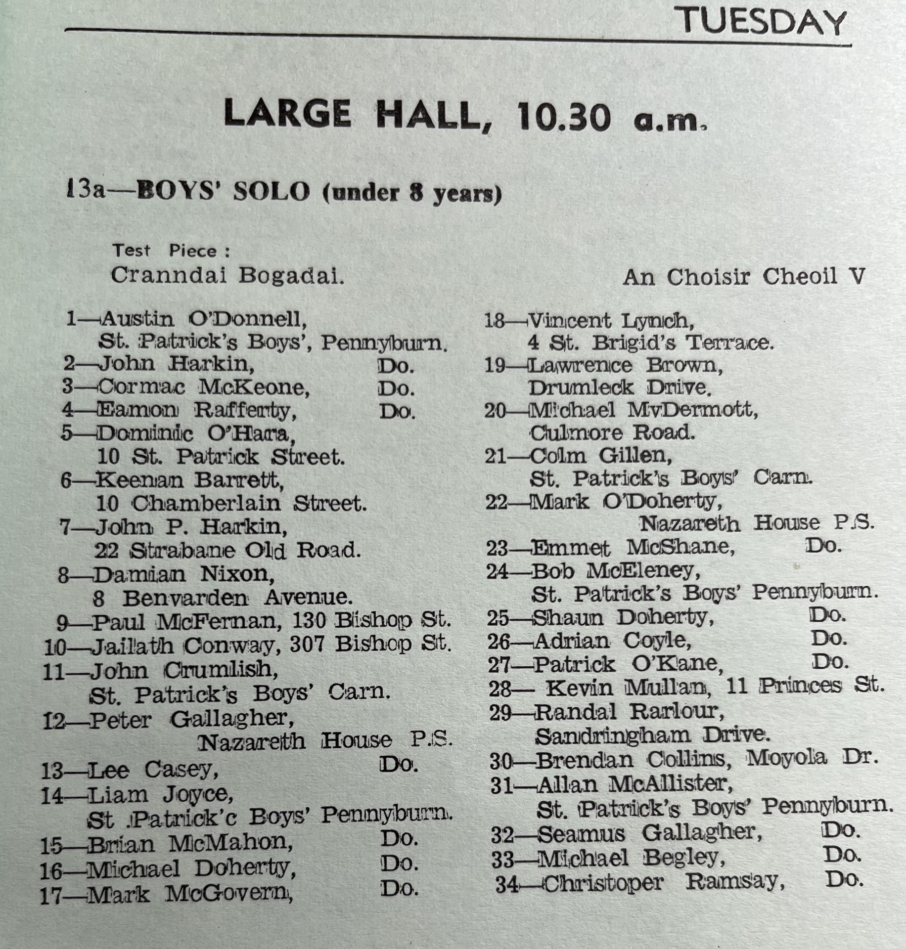 What was learned in singing class was put to the test at the various feiseanna which operated in that era, including Derry Feis of course.