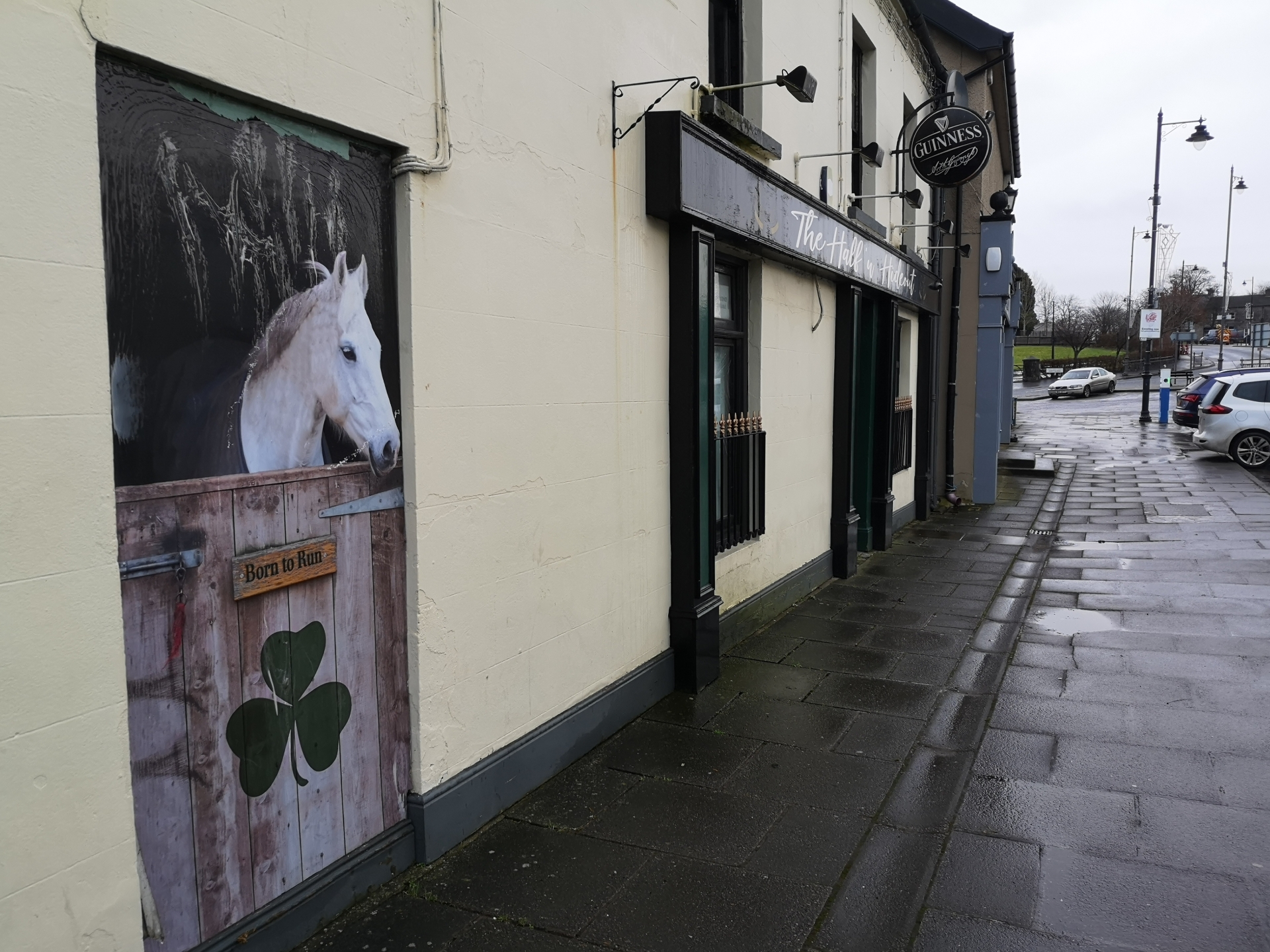 A painted horse peers out from the wall of the Half'n Hideout Bar. 'Born to Run' reads the caption underneath. The shamrock below serves as a stark reminder of when this all began.
