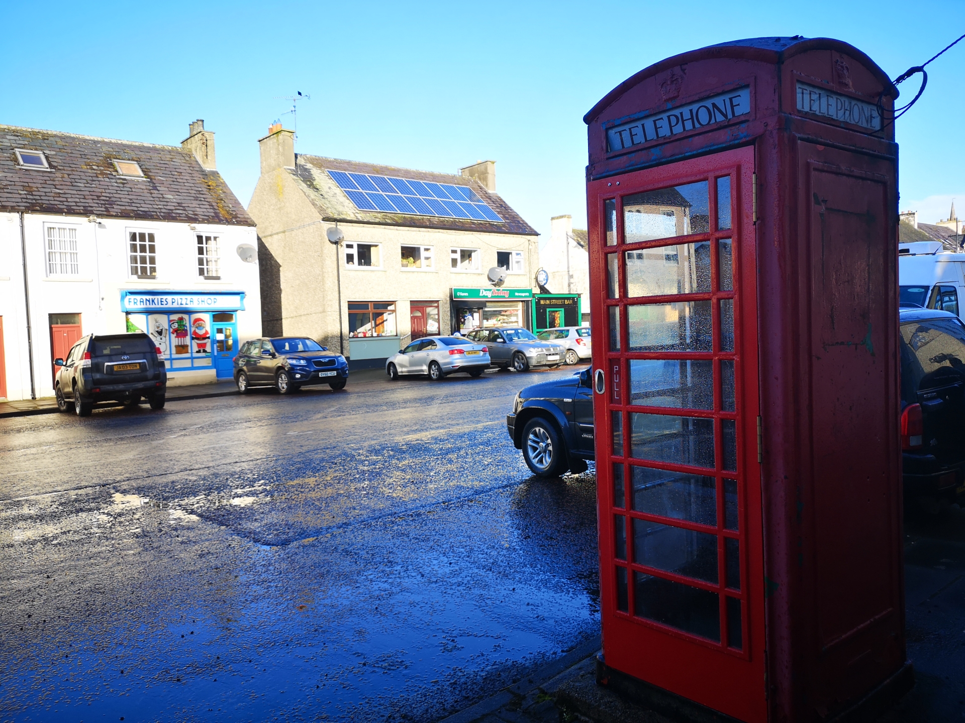 OLD AND NEW: The traditional phone box and shop front, with solar panels on the roof.