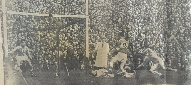Twenty-five years before Downey's fisted goal, Derry were again attacking the Railway goals. Owen Gribbin did the spadework earlier in the move. 'Chuck' Higgins and Brian Mullan went close in a goalmouth scramble before Owen Gribbin finished to the net.