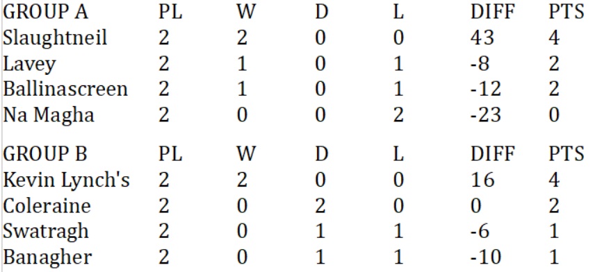 There was a full round of game on elsewhere. Slaughtneil were 0-26 to 0-13 winners at Lavey, while Coleraine earned their second draw of the campaign against Swatragh in Glenullin.