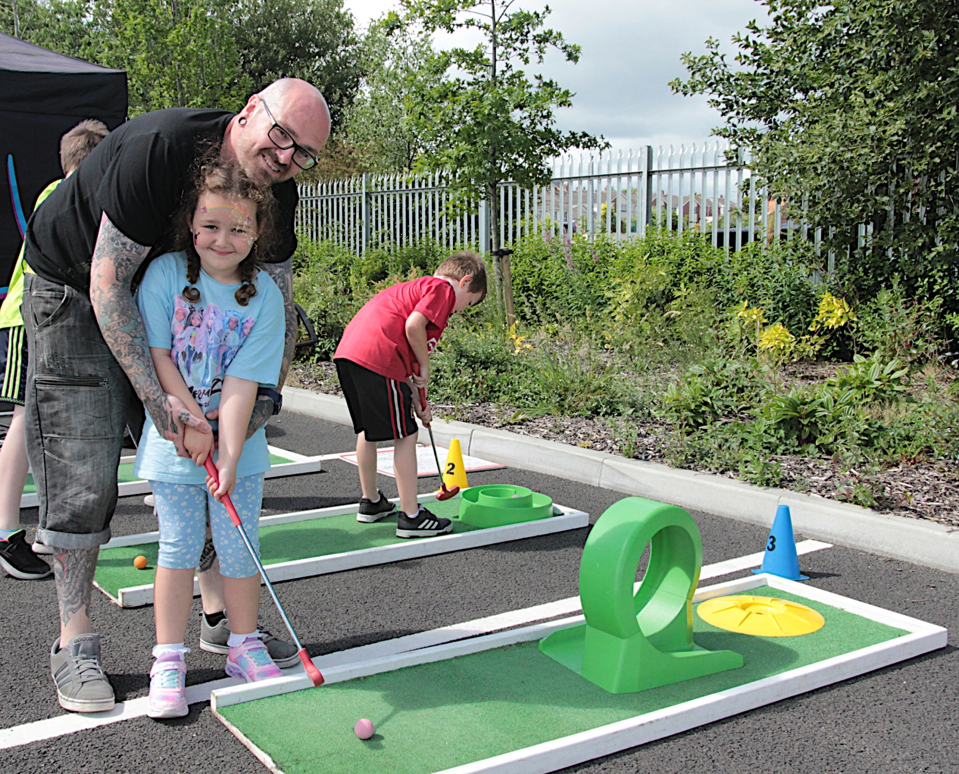 Harley Donnell and her daddy Ryan playing mini golf.