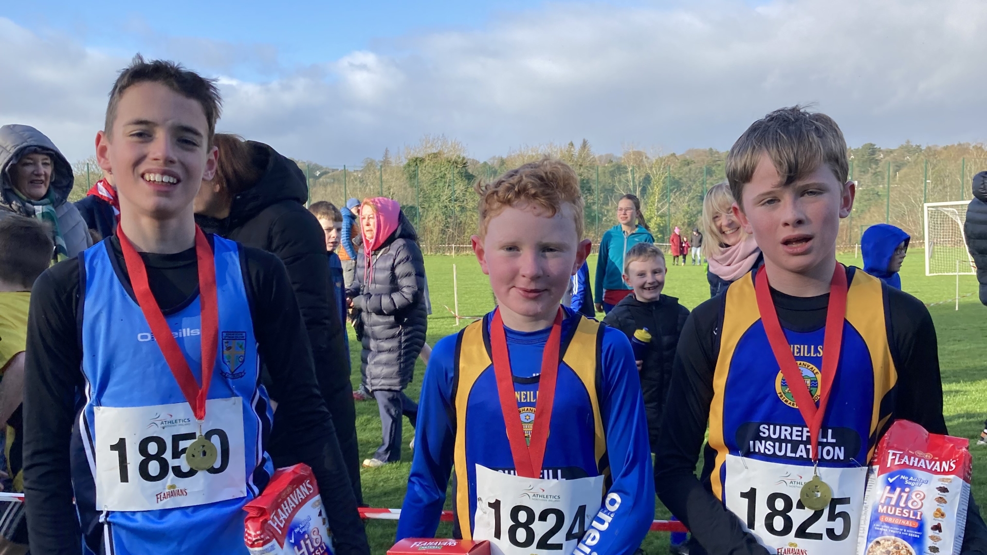 L-R: Paul Devine in 2nd place, Tomas McCloskey in 1st place and Aidan O’Donnell in 3rd place in the boys’ race at the third round of the 2023-2024 Flahavan’s Athletics NI Primary School Cross Country League which took place at Oakgrove College, Stradreagh.