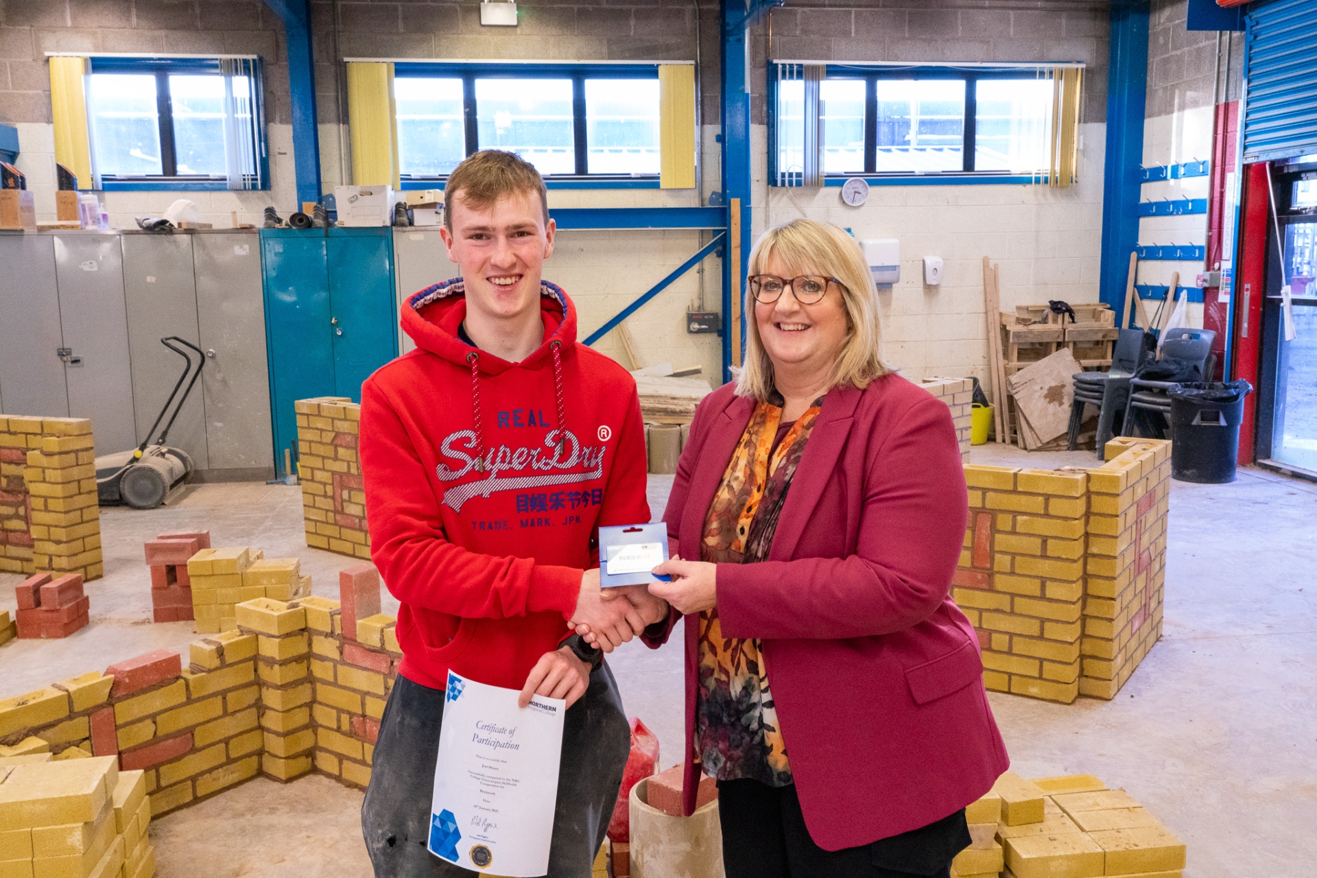 2nd place Brickwork winner Joel Deans pictured with Gayle Beckett, CITB NI Project Manager at the College’s annual inter-campus heats of Skillbuild NI 2025