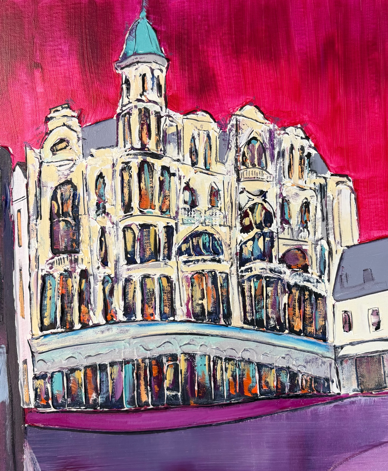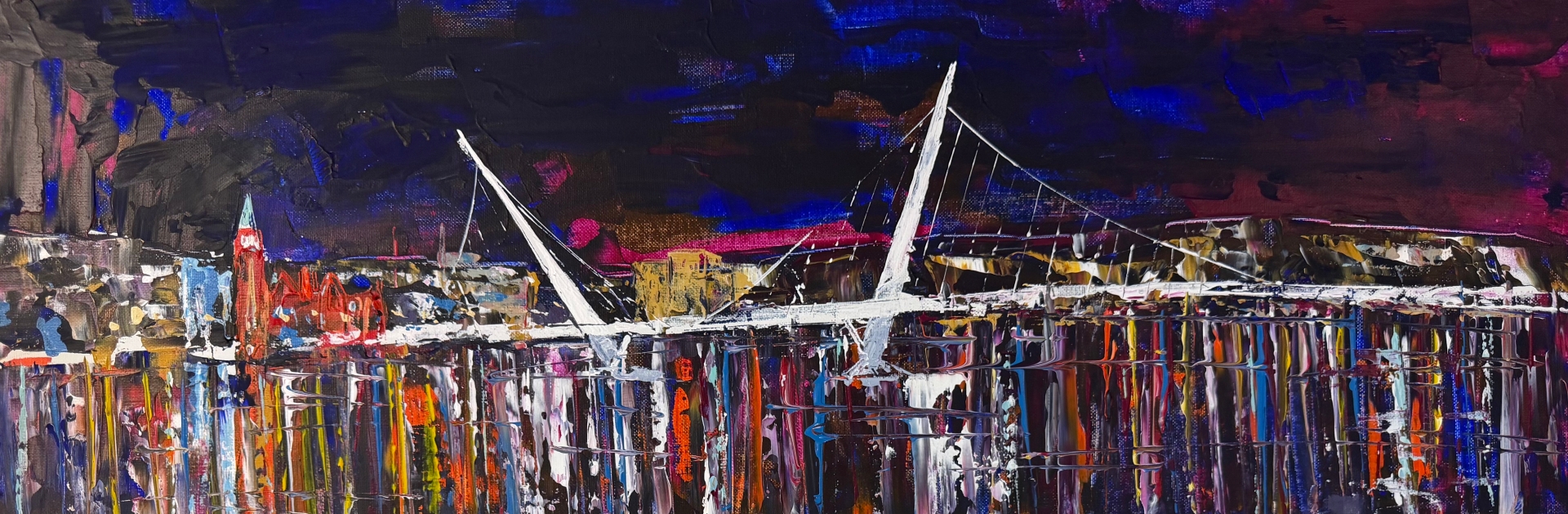 Speaking ahead of the exhibition, Margey said: “I am thrilled to be back at The Ebrington Hotel with this new body of work and am really looking forward to welcoming visitors to experience this extensive collection. Highlights include bold interpretations of the Peace Bridge (below), the Guildhall, Austins and Shipquay Street, alongside expressive depictions of Inishowen, Errigal, The Poison Glen, Marble Hill, Glenveagh, Downhill, Portrush, and Portstewart to name a few.’