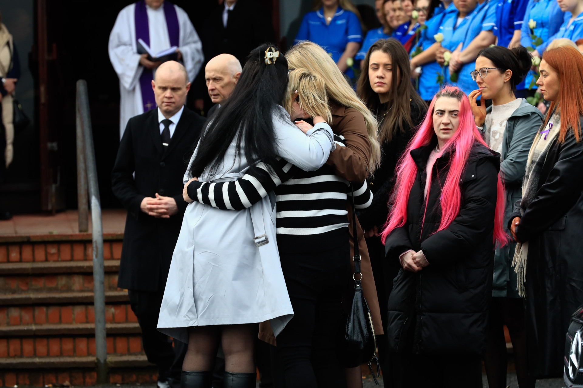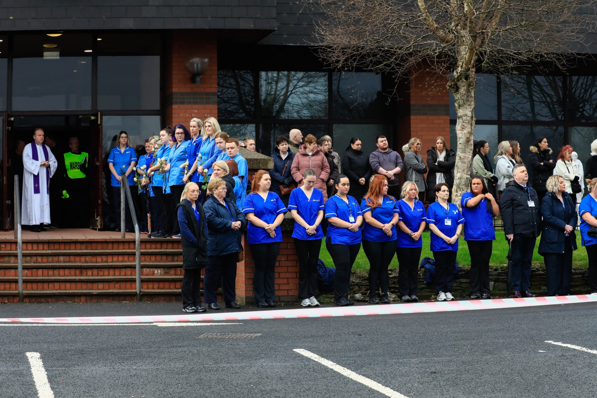 Care workers form a guard of honour for their colleague, Derry murder victim Amy Doherty at Holy Family Church, Ballymagroarty on Thursday morning. Included is Fr. Joe Gormley, P.P.