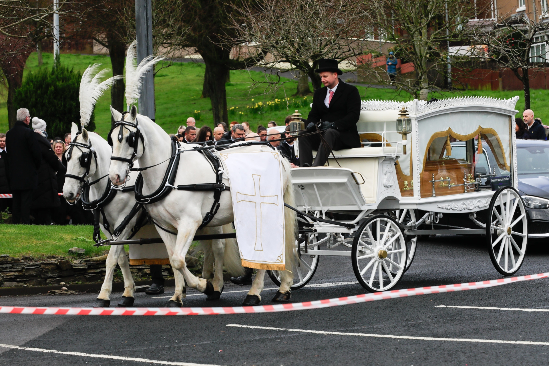 A huge crowd gathered at Holy Family Church in Ballymagroarty to meet the white horse drawn carriage that carried the remains of the mother-of-two young children.