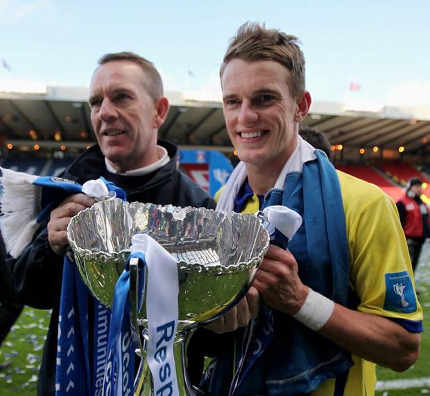 Kenny and Dean Shiels celebrate Kilmarnock's 2012 Scottish Cup success.