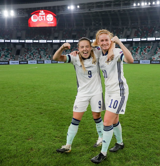 Simone Magill and Rachel Furness celebrate Northern Ireland's 1-0 win over Belarus in the Dinamo National Olympic Stadium, Minsk. (Pic: Philip Magowan/Press Eye)
