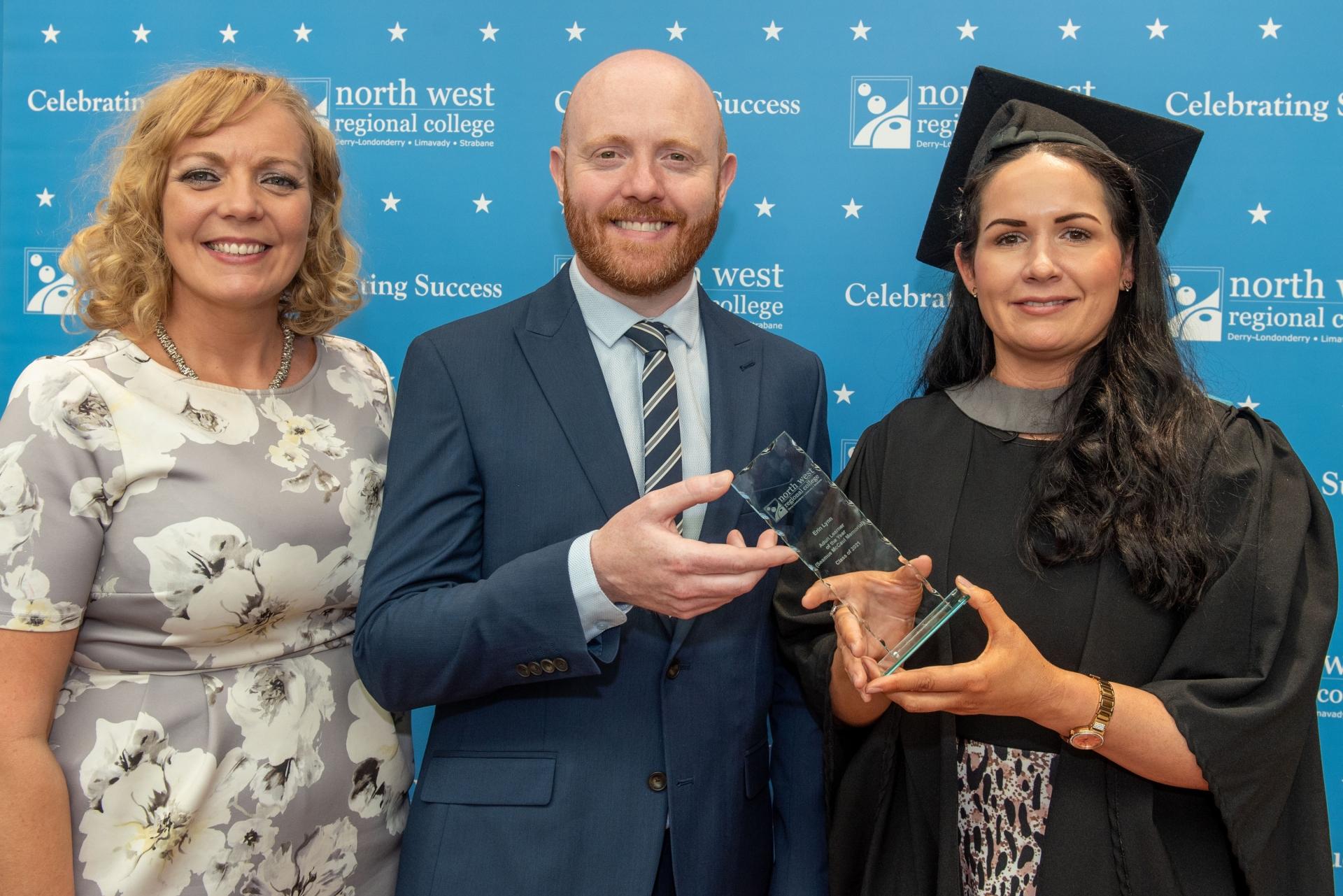 Above: NWRC's Business Skills Manager Sinead Hawkins presents the award in memory of her father Seamus McCaul for the Access Diploma in Combined Studies Adult Learner of the Year to Erin Lynn, from Dungiven, also pictured is event MC Barra Best.