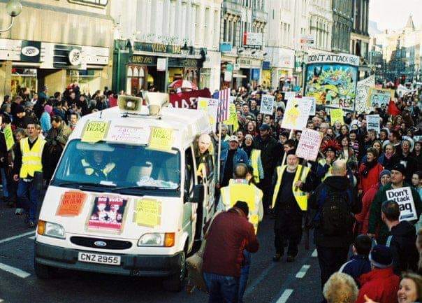 Derry Anti War coalition posted a photograph from February 15, 2003: "Millions on the streets worldwide against the war in Iraq. Dermie McClenaghan leading the charge in Belfast.Derry has lost one of the best. RIP Dermie.