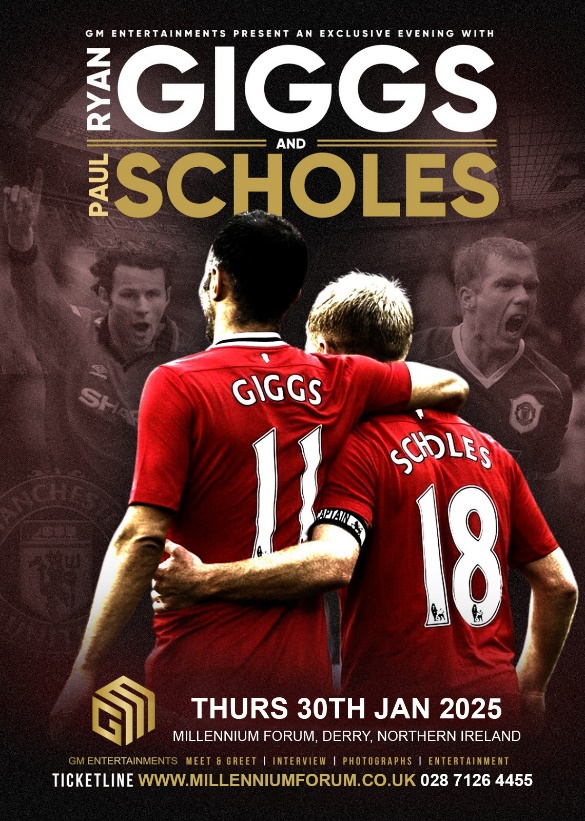 Derry football fans are in for a treat when legendary Manchester United players, Ryan Giggs and Paul Schools, arrive in the city for a special evening at the Millennium Forum on Thursday, January 30, 2025.