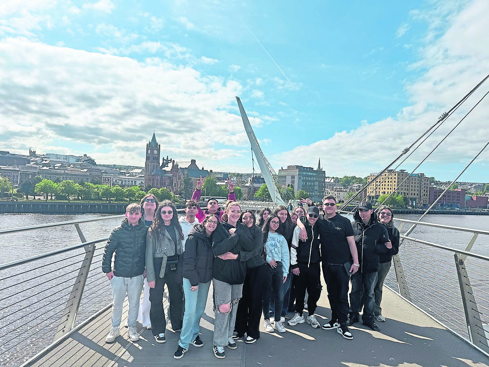A group of students pose for a picture on Derry’s iconic Peace Bridge.