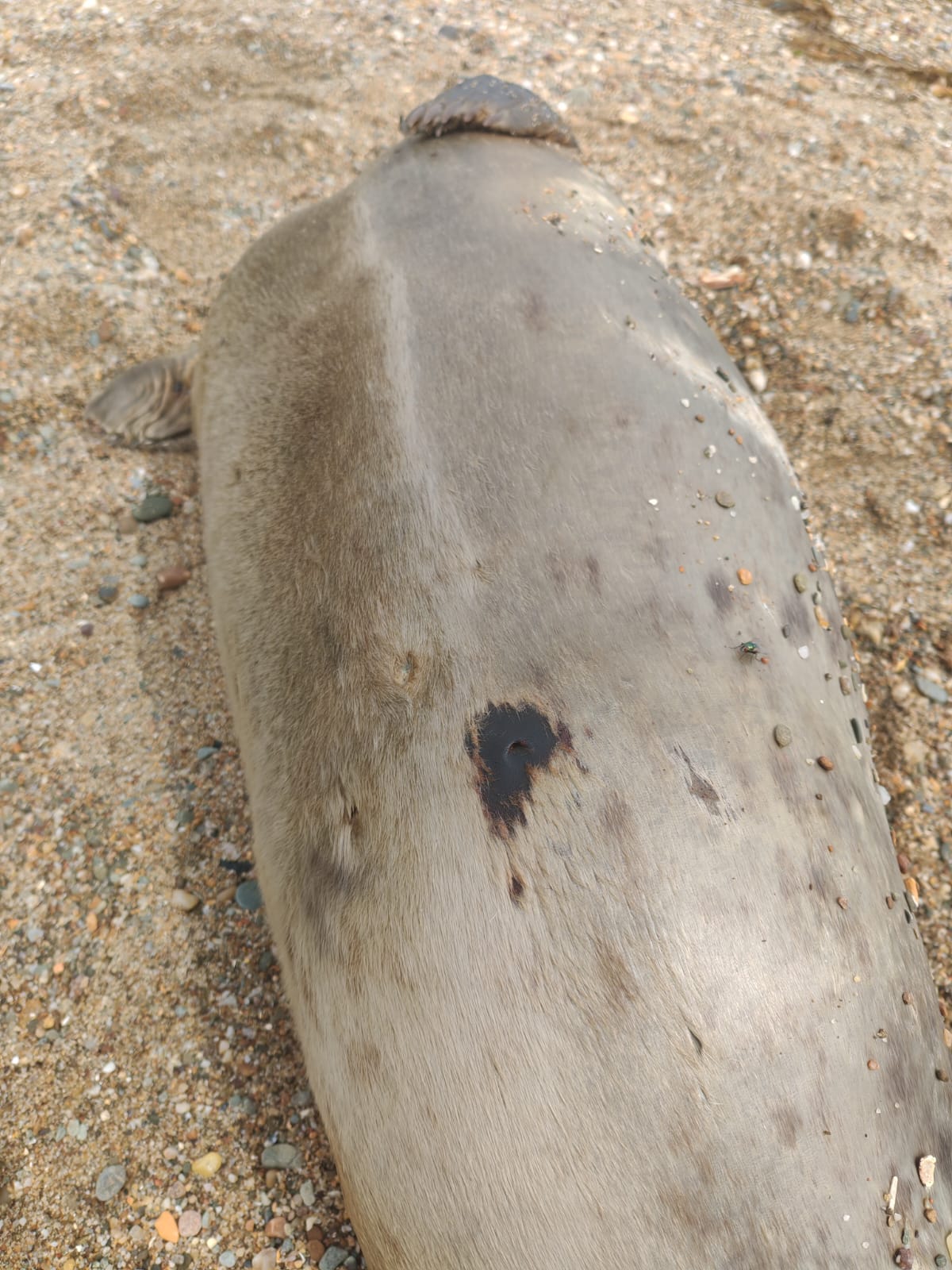 The bullet wound on the Zig the dead Greencastle harbour seal.