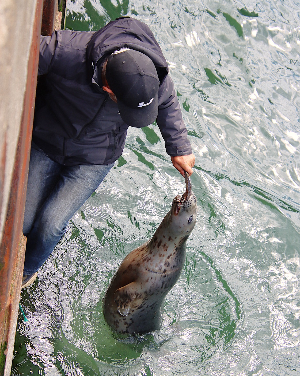 Skipper Liam O'Brien feeding Zig herring in Greencastle Harbour.