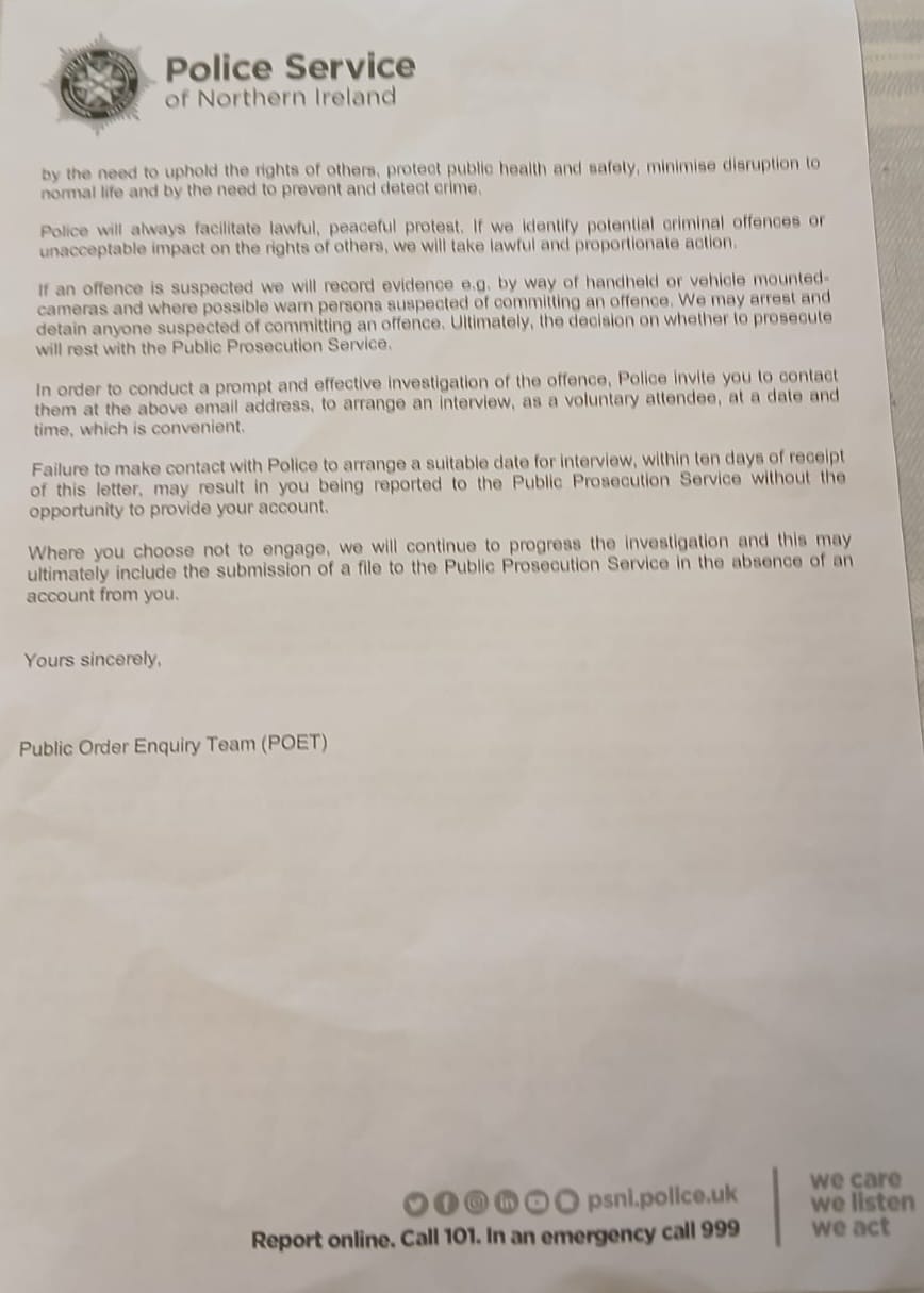 “Police also have grounds to suspect that you may have committed an offence under Section 12 (1a) of the Terrorism Act 2000 in that you expressed an opinion or belief that is supportive of a proscribed organisation, in this case Palestine Action, and that in doing so were reckless as to whether a person would be encouraged to support the organisation,” added the letter.