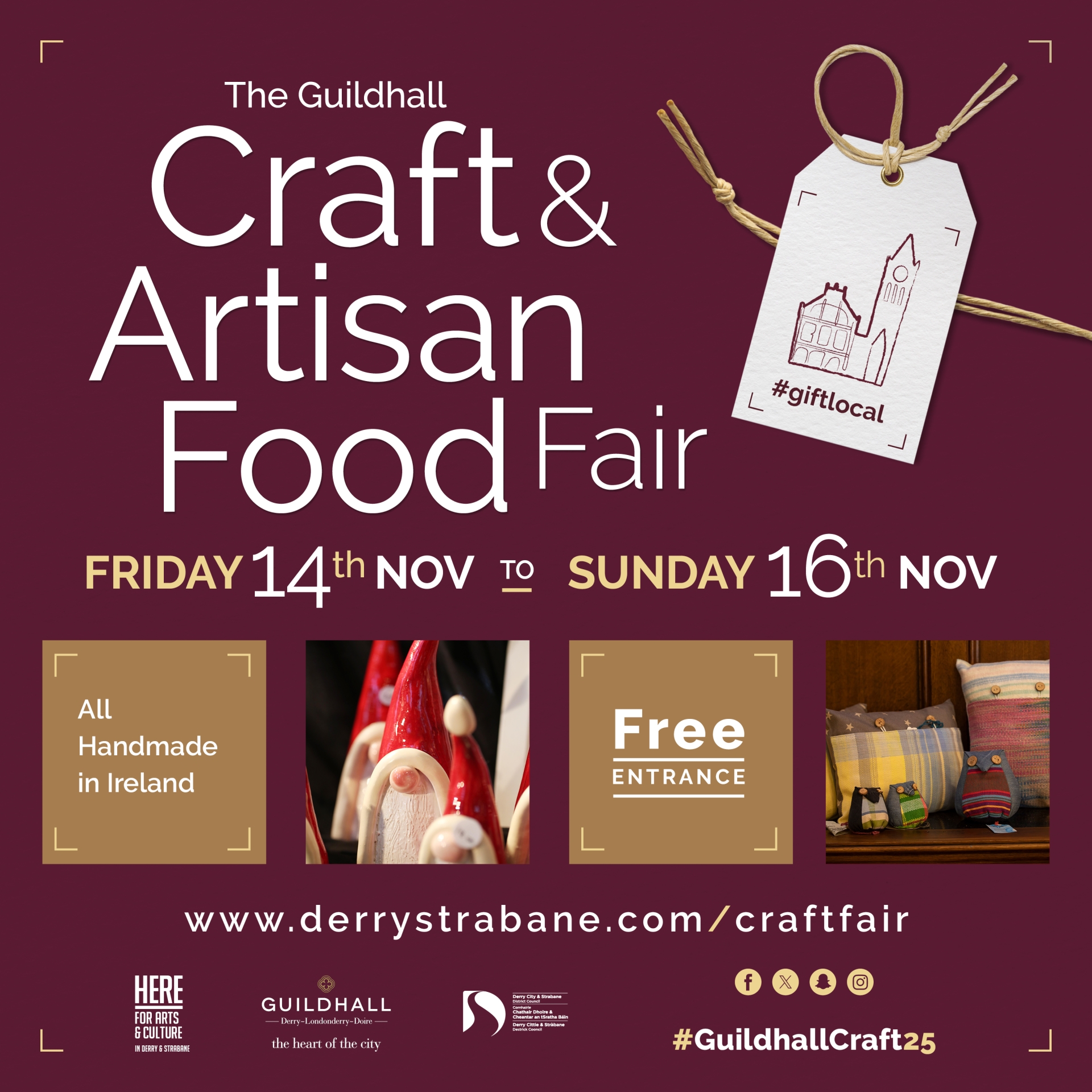 The Guildhall Craft Fair 2025 takes place from Friday, November 14 – Sunday, November 16 2025, from 10.00am – 6.00pm daily at the Guildhall, Derry. Entry is free.