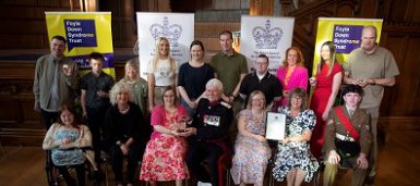 The Vice Lord Lieutenant Alan Moore, OBE, presenting the King's Award for Voluntary Service and badges to volunteers and directors at an awards ceremony in the Guildhall in April.