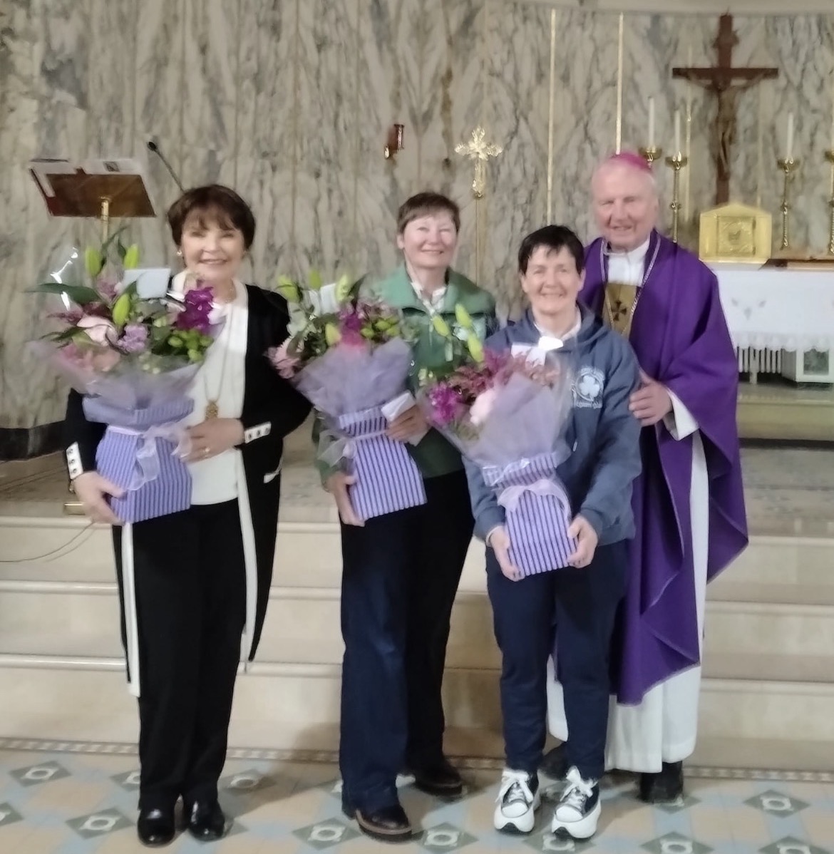 Dana and pilgrim guides and retreat leaders Martina Purdy and Elaine Kelly alongside Bishop Donal McKeown on Saturday as the retreat ended at St Patrick’s Dungiven.
