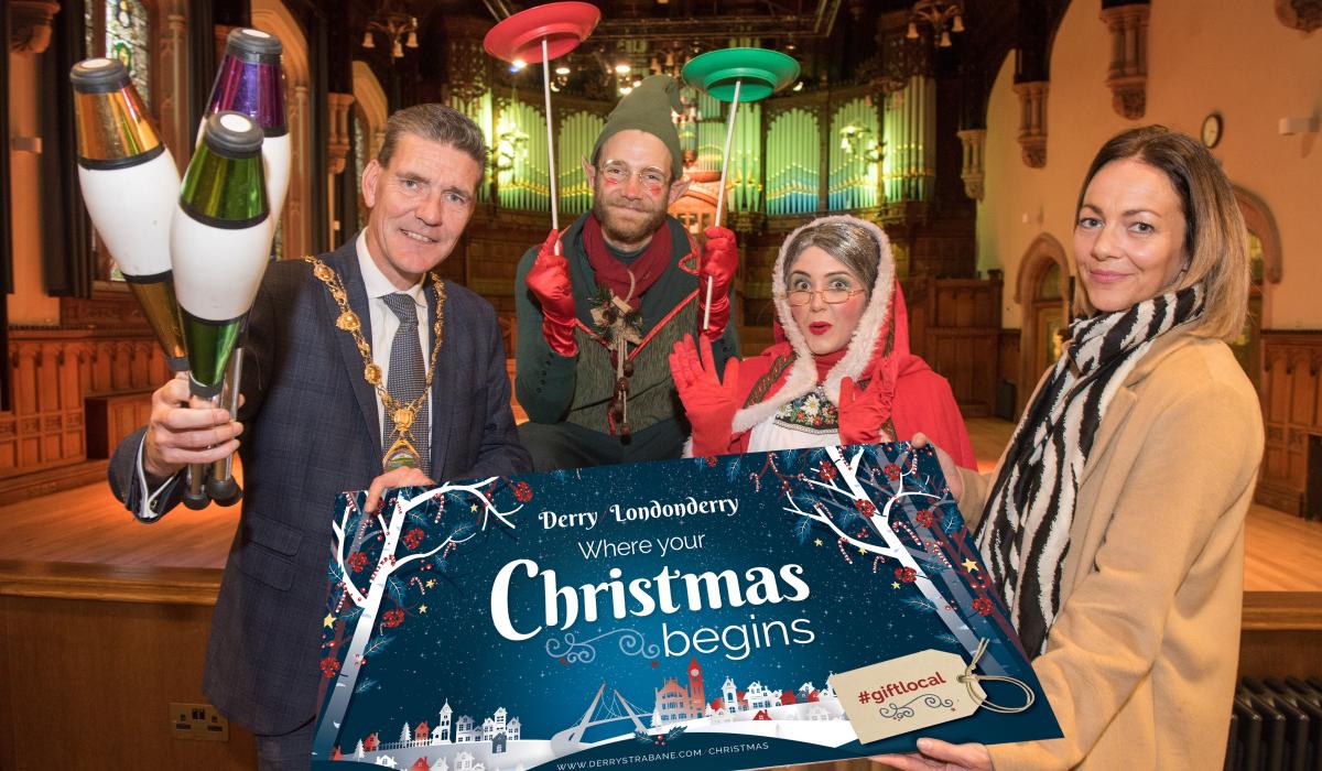 A Grand Christmas Procession through the city centre and the return of the popular Strabane Fayre and Guildhall Craft Fair are just some of the highlights in Derry City and Strabane District Council’s exciting programme of festive events for 2018. The programme was launched this week and begins with Christmas light switch-ons throughout the City and District including the city’s in Guildhall Square and Waterloo Place on Thursday November 22nd and Strabane switch-on Saturday November 24th. The popular Christmas Winterland Markets in Guildhall Square will also make a welcome return from Thursday 13th – Sunday 16th December with a bar serving craft and artisan drinks, live music, kids entertainment and festive animation. Mayor of Derry City and Strabane District Council, Councillor John Boyle, will host his own Christmas initiative when he invites youngsters to step into the majestic wonderland of Santa’s Christmas Workshop in the Guildhall with story-telling, Christmas crafts and an appearance from the man himself, Father Christmas. Mayor Boyle said the programme will allow local people to celebrate Christmas in style and will also play a key role in attracting visitors to the City and District during the festive season. “With excitement already building for Christmas I am delighted that we are able to offer a varied and exciting festive programme to allow local families and visitors to celebrate the 2018 holiday season,” he said. “I would like to congratulate the Festival and Events team at Council for developing a majestic programme of music, colour and animation. “I am particularly excited about my own initiatives, the Christmas Tea Dances on December 5th and 18th and Santa’s Circus Workshop in the Guildhall where I will invite families to transport themselves into a winter wonderland on Saturday 8th and Sunday 9th December.” A new element to this year’s programme is the nightly Box Wonders performance from In Your Space from Thursday November 13th to Sunday December 16th when model toys will come to life from present boxes with a burst of colour light and sound when the Guildhall clock strikes 6 each night. The Grand Christmas Procession by LUXE at 6pm on December 15th is back after being particularly well received last year and will depart from the Christmas Markets in Guildhall Square and meander through the City Centre. On Sunday December 16th a Mini Walkabout Procession in Waterloo Place and Guildhall Square from 4pm – 6pm will see King Wenceslas on stilts and six golden geece thrill the crowds of seasonal shoppers. Encouraging people to come out and support the Christmas events and shop local, Aeidin McCarter, Head of Culture with Derry City and Strabane District Council said the Christmas campaign is a great opportunity to showcase what the City and District has to offer in terms of family entertainment and great shopping experience “We want to make our festive experience a special one not only for those who will come to spend the weekend in Derry and Strabane but for local residents. “Whether you are here for a weekend break or a one day shopping trip, we have something to offer you in terms of our retail offering, our wide range of bars and restaurants and our fantastic events calendar. “We are working very closely with our partners in Visit Derry to promote some fantastic accommodation offers that encourage couples and families to come to Derry and Strabane for a fantastic festive experience.” For more detailed information and updates on Derry City and Strabane District Council’s family-friendly Christmas programme please visit www.derrystrabane.com/christmasPictured above: Mayor of Derry City and Strabane District Council, Councillor John Boyle launches Council’s 2018 Christmas programme with Festival and Events Officer Andrea Canning, Mrs Claus and an Elf from the Elf and Safety Team who will be taking part in Santa’s Circus Workshop in the Guildhall.