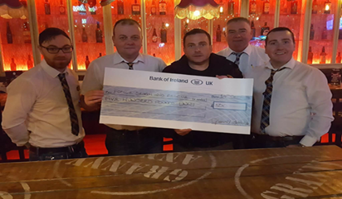 Staff from Grannie Annies bar in Derry presenting a donation to local charity, Foyle Search and Rescue. Five hundred pround was raised through a fundraiser held at the Waterloo Street entertainment venue. Eamon Eanetta, from Foyle Search and Rescued, is pictured receiving the donation from Grannie Annies staff, Emmet Helferty, Declan Villa, Paul Young and Gerard Casey.