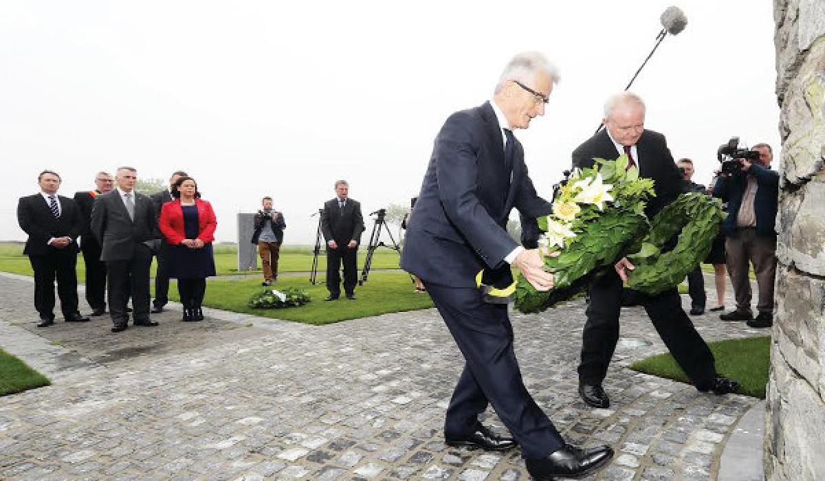 Sinn Féin's Martin McGuinness has ended his high profile visit to World War One battlefields in France. Today, he laid a wreath at the site of the Battle of the Somme where soldiers of the 36th (Ulster) and 16th (Irish) divisions fought together. Yesterday, he laid a wreath to Irish soldiers who fought in the battle at the Island of Ireland Peace Park in Messines alongside the Prime Minister of Flanders Geert Bourgeois (pictured). Mr McGuinness said his visit was an attempt to recognise soldiers from Ireland who died in the battle and its importance to unionists and an ‘important contribution to the process of reconciliation in Ireland’. . He said the visit to both sites should be part of looking at a ‘shared culture of commemoration and remembrance’ in Ireland. "Tens of thousands of Irish men died in the First World War and they were all sons of Ireland," he commented. "So this is an opportunity for our party leadership to pay respects at the sites where they died. “And in this decade of centenaries during which we commemorate the centenary of the Easter Rising and the Battle of the Somme, initiatives such as this should be embraced as an opportunity to develop a shared culture of commemoration and remembrance respecting all of our traditions in Ireland on the basis of parity of esteem and equality."