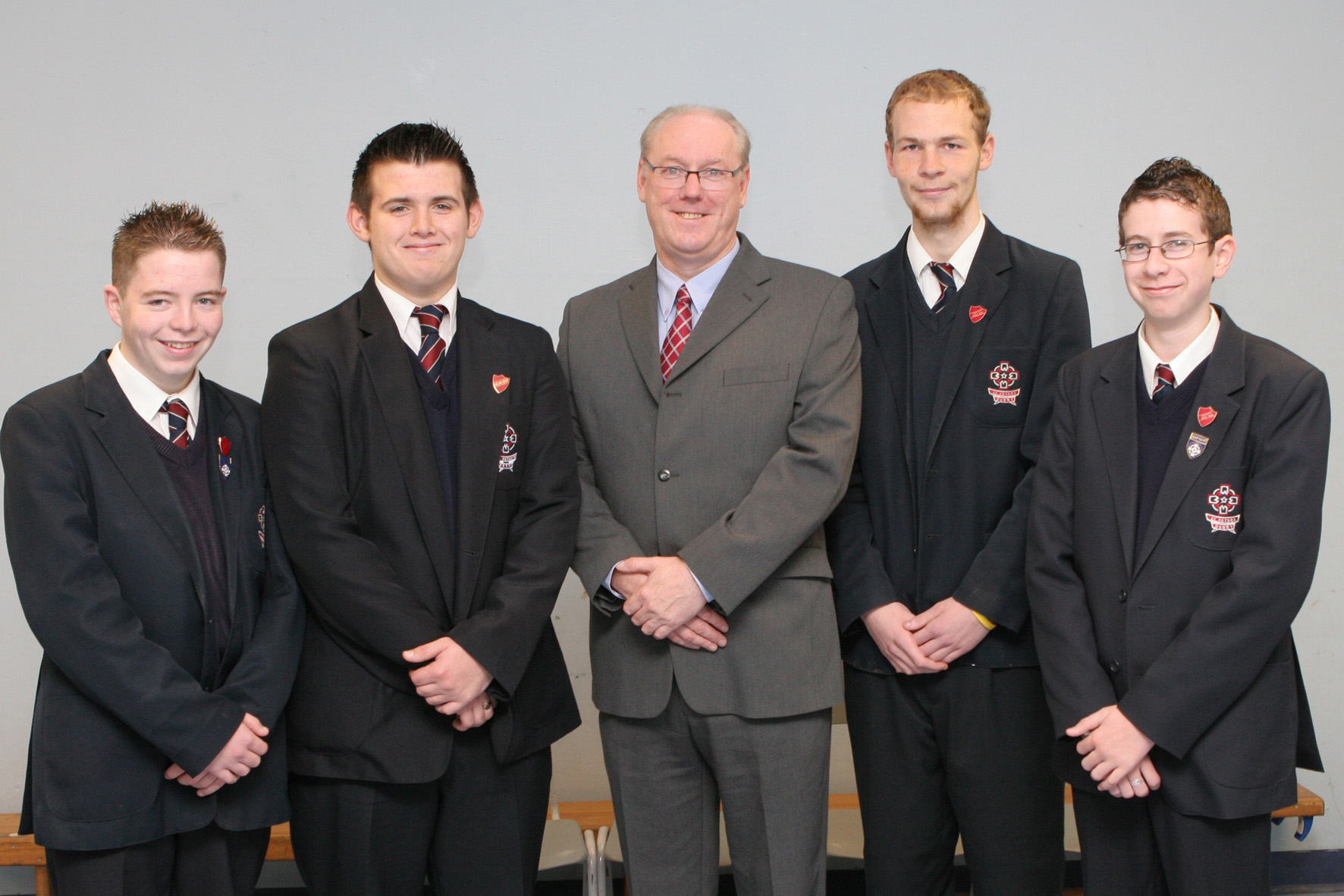 Martin Bowen, principal, pictured with Head Boy Marc McCloskey. Included are Deputy Head Boys, Sean Paul Campbell, on left, and, from right, Sean McAnaney and Liam Allen.