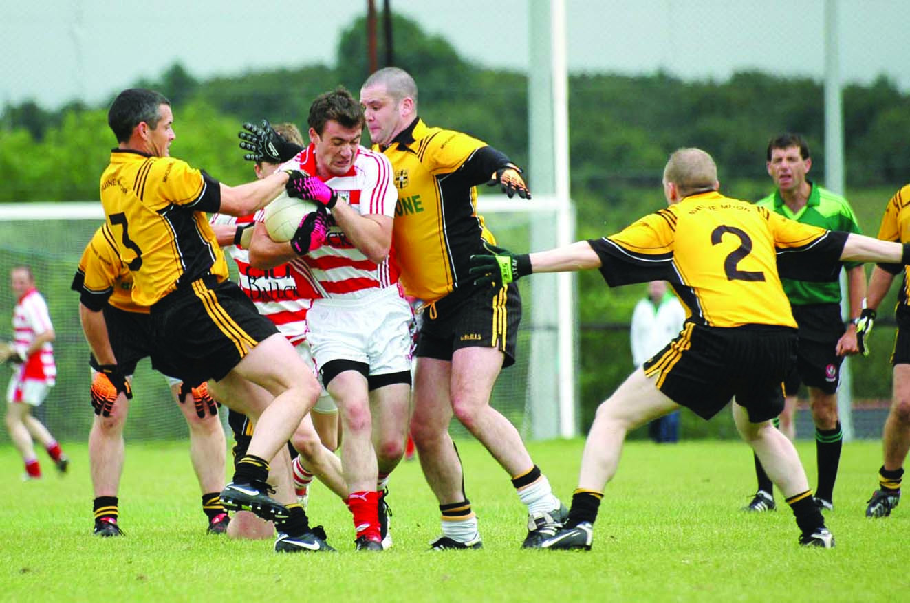 Richard Scullion and Ryan Barker get the tackles in as Kevin Vallely blocks Barry Doherty's path in Moneymore's 2010 win over Ballerin (Pic: Sean Burke)
